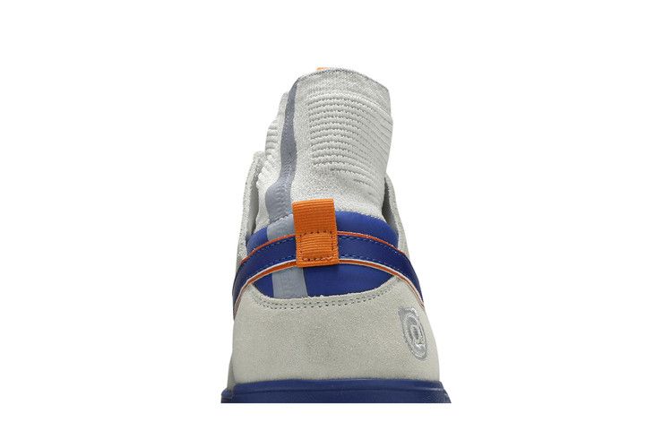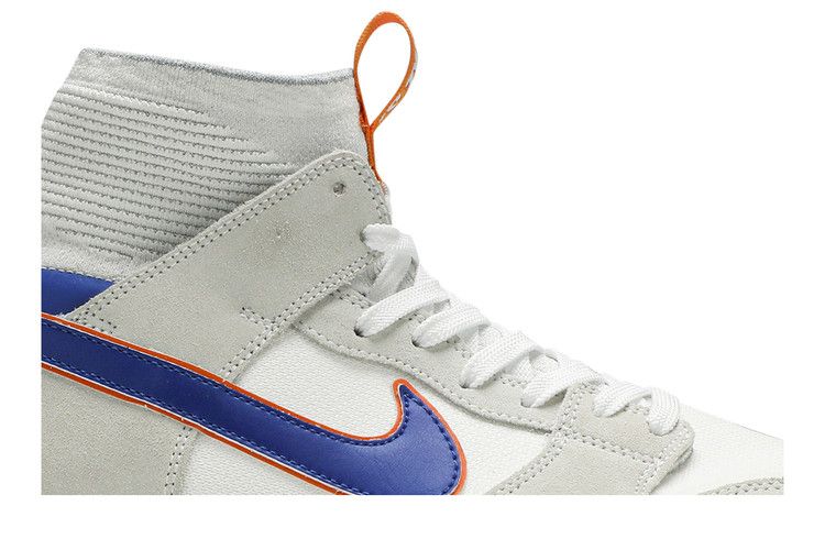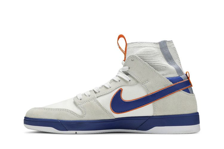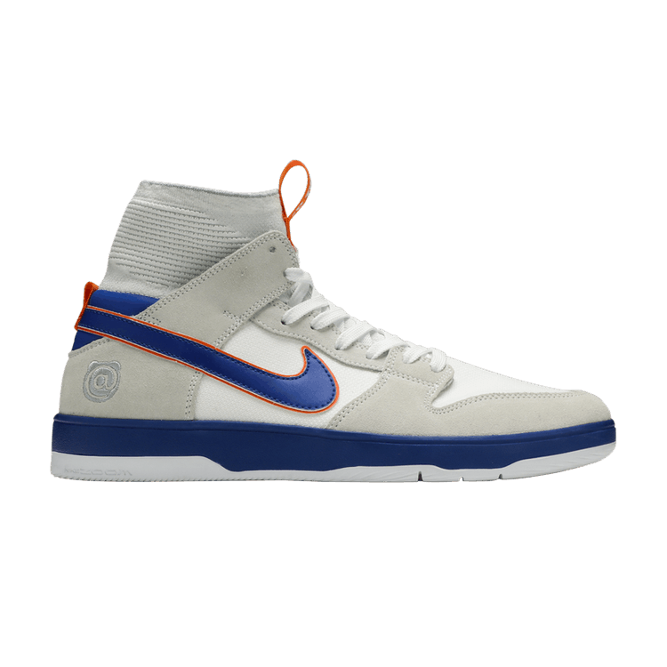 The Nike SB Dunk High Elite Medicom (2018) is a collaboration between Nike SB and MEDICOM TOY, updating their 2004 Dunk Low design. The high-top features a white mesh upper with whitish-gray suede overlays, a blue leather Swoosh with orange outline, and orange webbing pull loops. A white knit ankle collar ensures comfort, while the blue foam midsole sits atop a white rubber outsole with traction grooves. Embroidered Bearbrick branding appears on the lateral heel. Released on May 5, 2018, the Nike SB Dunk High Elite Medicom (2018) is available now at Side Kicks.