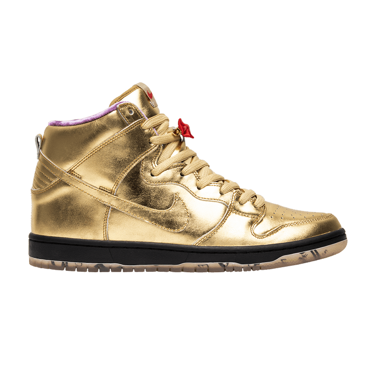 The Nike SB Dunk High Humidity features an all-gold upper with a black midsole and red bowtie shoestring lock. The translucent sole includes music note graphics, drawing inspiration from jazz....