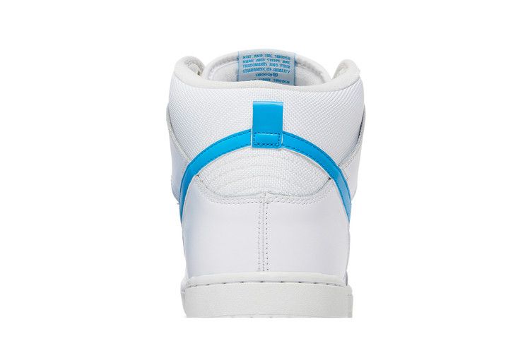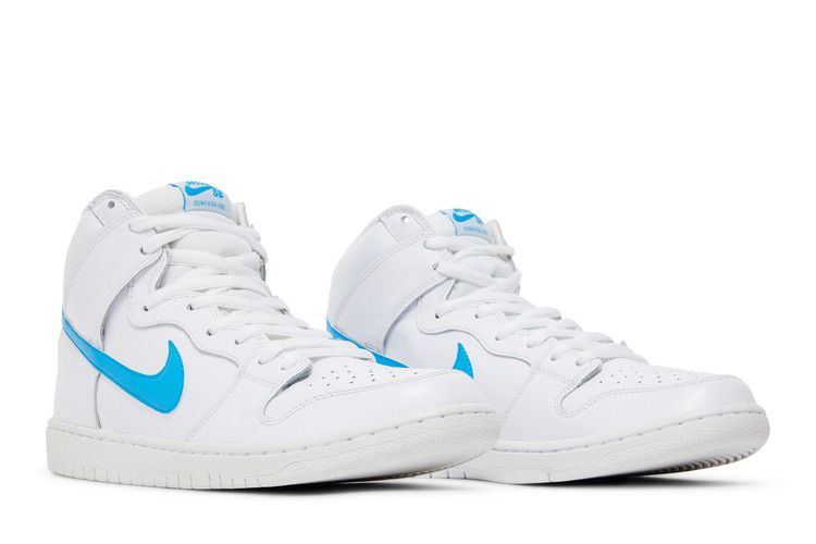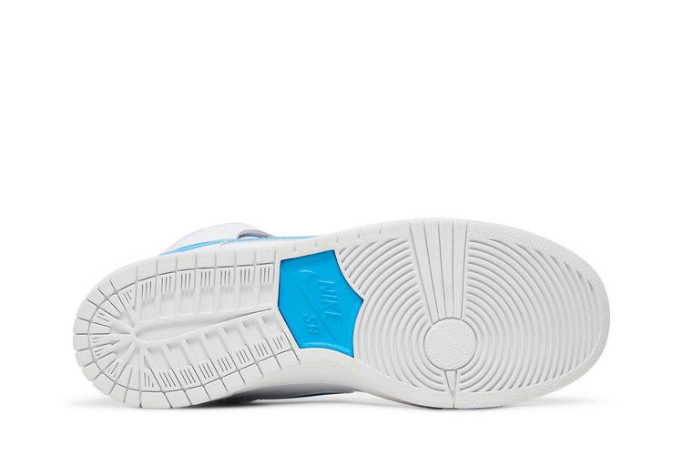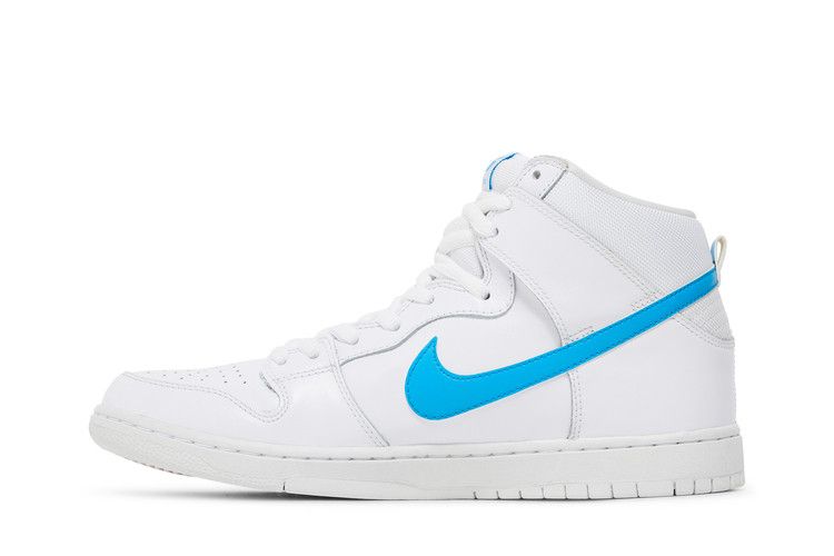 Originally part of Nike's university athletics program, the Dunk was later adapted for skateboarding under Nike SB. This high-top version reinterprets the 2002 Richard Mulder Dunk Low colorway in white and Orion Blue.