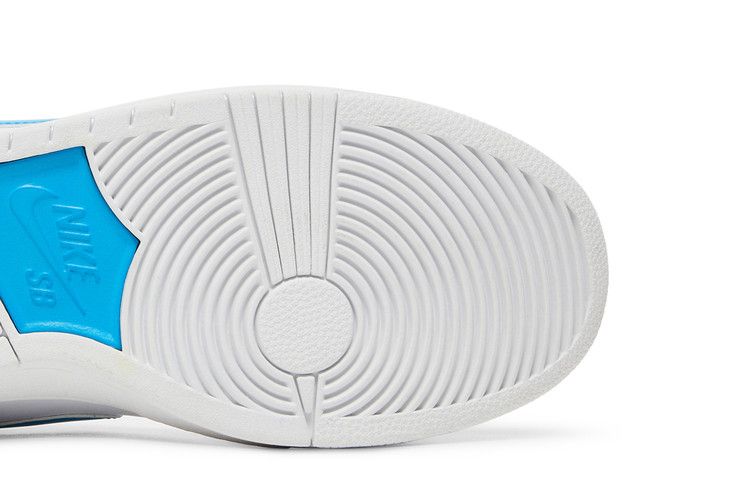The Nike SB Dunk High Mulder features a white leather upper with Orion Blue leather Swoosh branding on the sides. A white mesh panel accents the heel collar, while Nike...