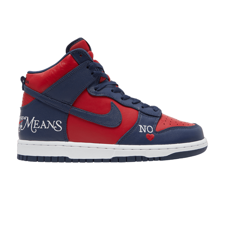 The Nike SB Dunk High Supreme By Any Means Navy features a smooth red leather upper with navy overlays and Swooshes, inspired by the 2002 Japanese-exclusive Dunk CO.JP colorway. Custom...
