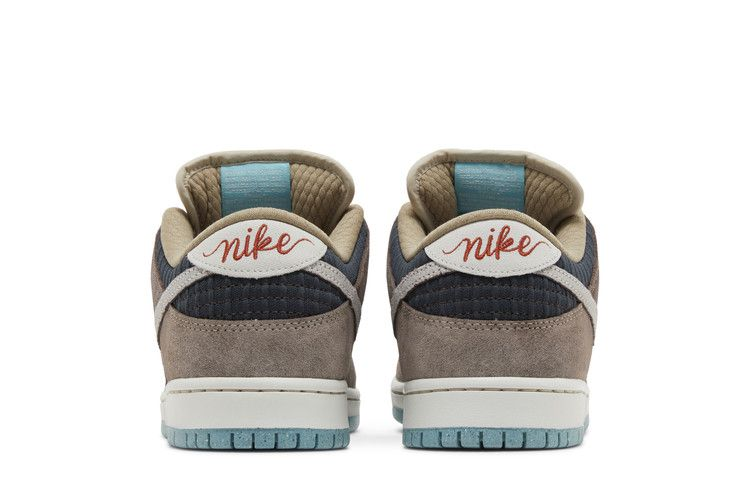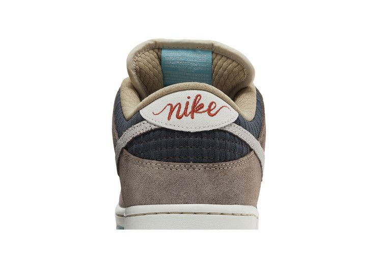 The Nike SB Dunk Low 'Big Money Savings' draws inspiration from the discounted offerings of big box stores. Its design features braided rope laces, a tan canvas toe box, silver brocade quarter panels, taupe suede overlays, and a cracked leather Swoosh in ivory. Details include a teal Nike SB tongue tag, 'Nike' in crimson script on the canvas back tab, and an interior tear-off receipt labeling 'Big Money Savings'. The sneaker is grounded by a turquoise rubber outsole.