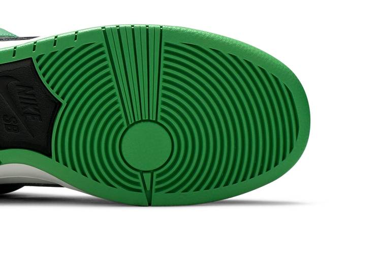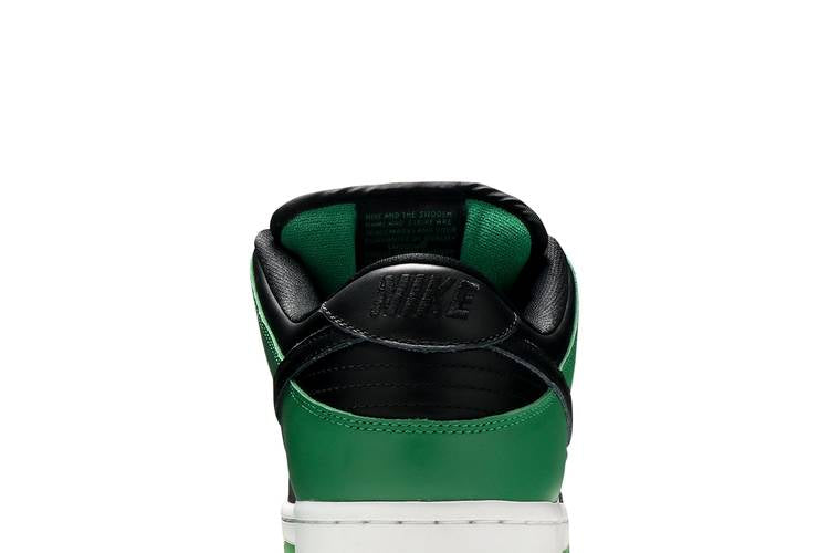 The Nike SB Dunk Low Classic Green features a white leather upper with black overlays and Swooshes, accented by Classic Green on the rear, laces, and tongue branding....
