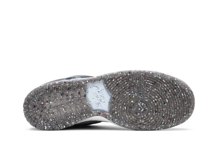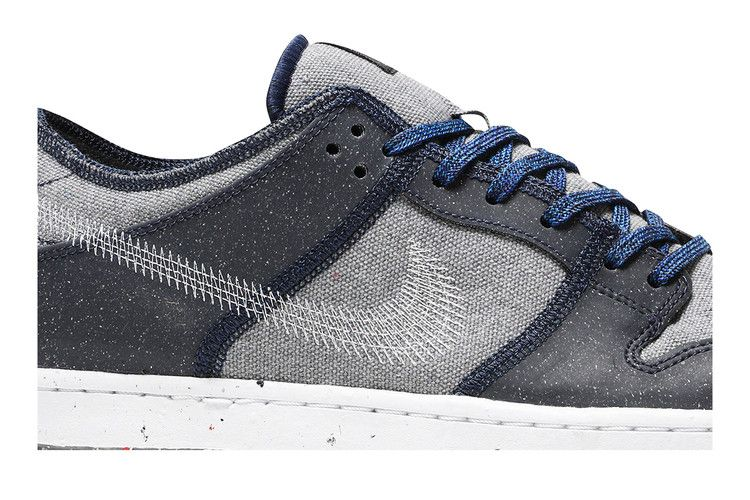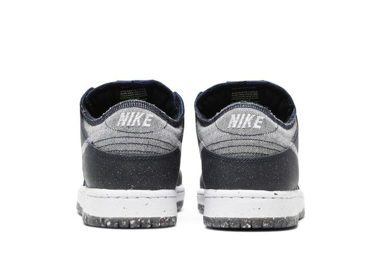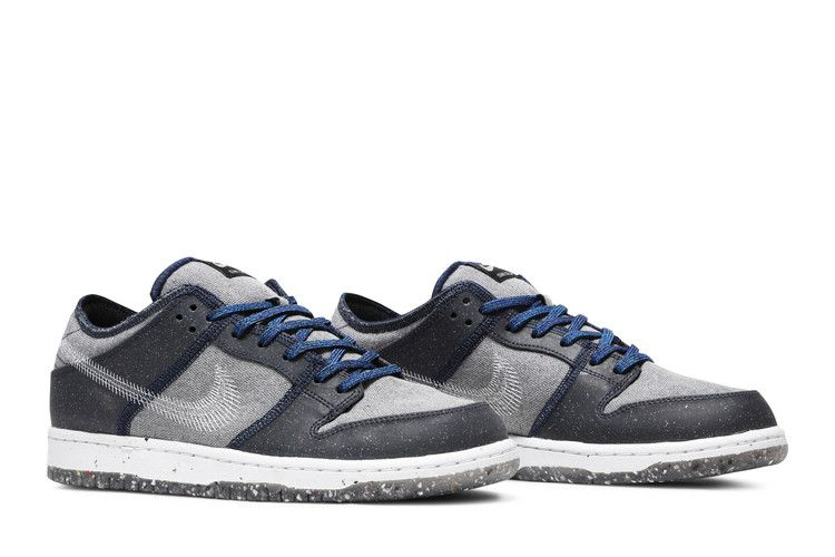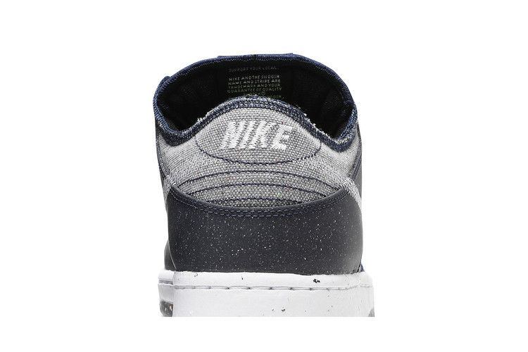 The Nike SB Dunk Low Crater is a sustainable addition to the brand's skateboarding line, featuring a deconstructed upper made from recycled materials such as canvas and synthetic leather. Decorative stitching is used on the heel tab and Swoosh, with a Nike SB woven tag on the tongue. The midsole combines Nike Grind rubber and standard foams, while the outsole is crafted from speckled Nike Grind rubber. The insole includes a Zoom Air unit made from recycled TPU. The design features a grey woven upper with dark grey overlays and embroidered Swooshes, finished with a white midsole and Nike Grind outsole. Released in October 2020.