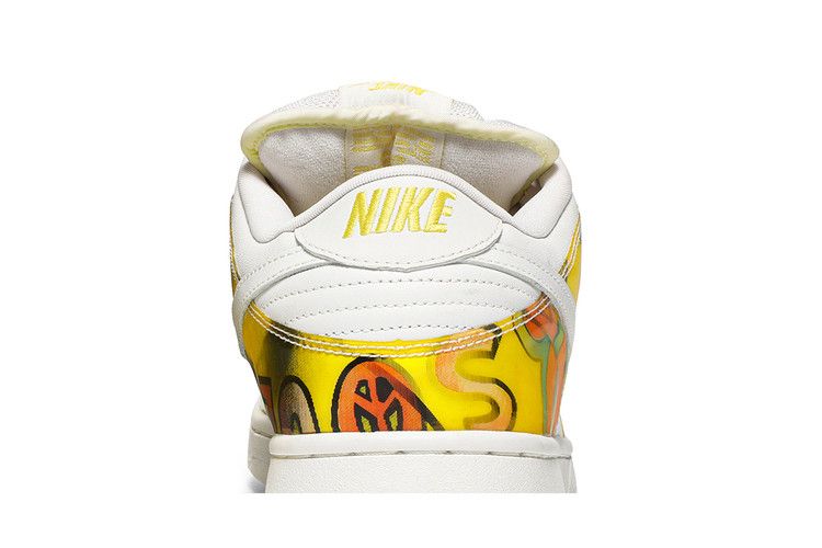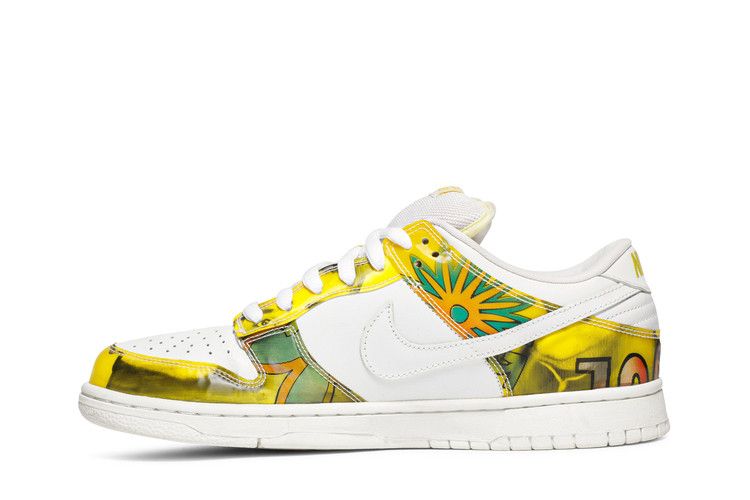 The Nike SB Dunk Low De La Soul 2015 draws inspiration from the "3 Feet High and Rising" album cover, reimagining the 2005 colorway in a low-top silhouette.