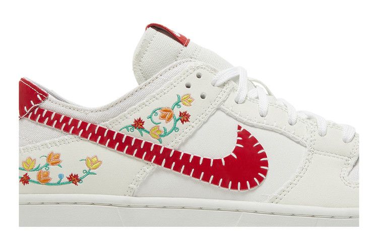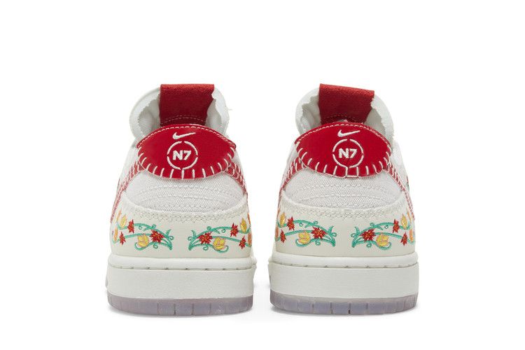 The Nike SB Dunk Low Decon N7 Opti Yellow University Red features a white canvas upper with floral embroidered suede overlays and an exposed-foam tongue. The design includes a red...