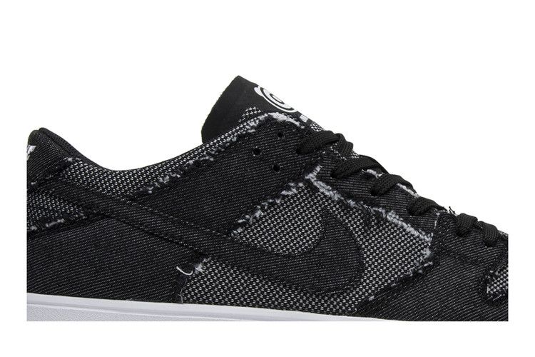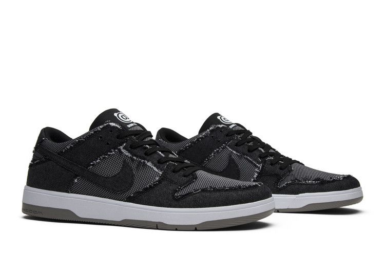 The Nike SB Dunk Low Elite Medicom Bearbrick features a black and grey denim upper with tattered edges and distressed accents. It includes a supple sole, Zoom cushioning, and a...