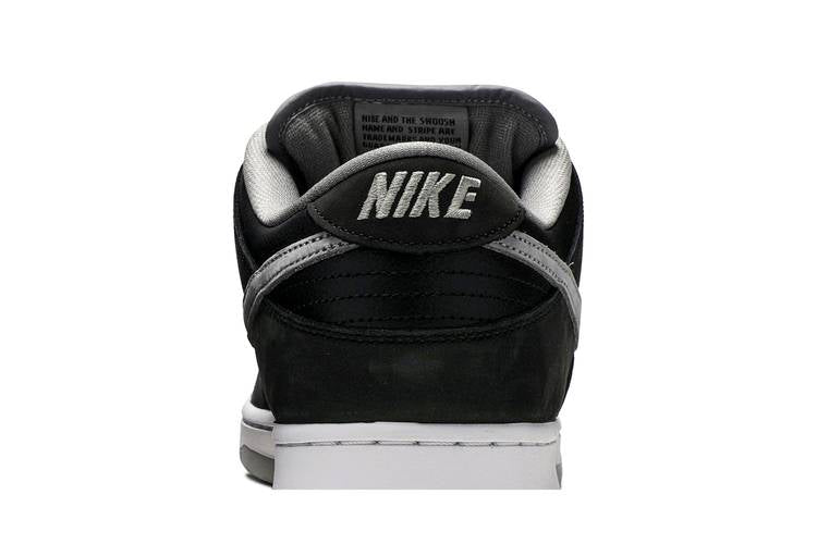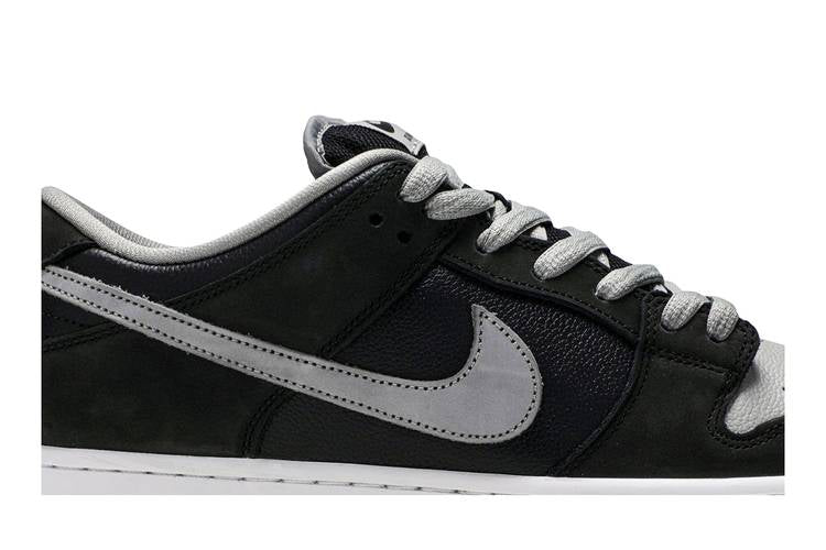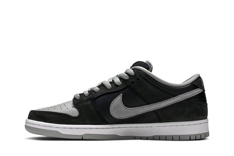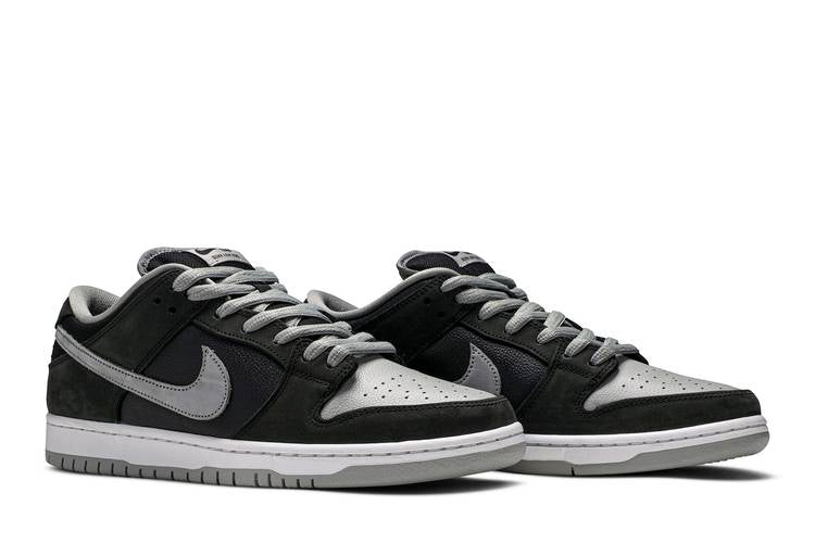 The Nike SB Dunk Low J-Pack Shadow sneakers combine black, white, and Shadow Grey leather and suede for a sleek and versatile look.This model features a predominantly black upper with a distinctive Shadow Grey "Swoosh" design and a white "Zoom Air" unit in the heel for comfort. Released in February 2020, these sneakers are stylish and functional for everyday wear.