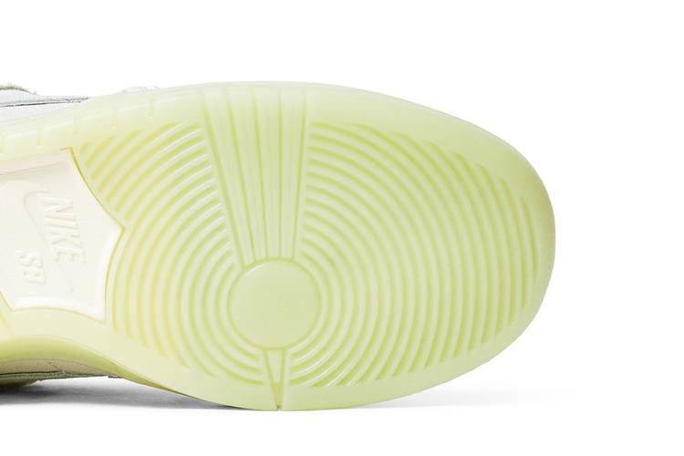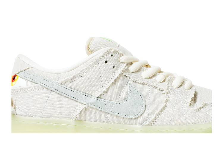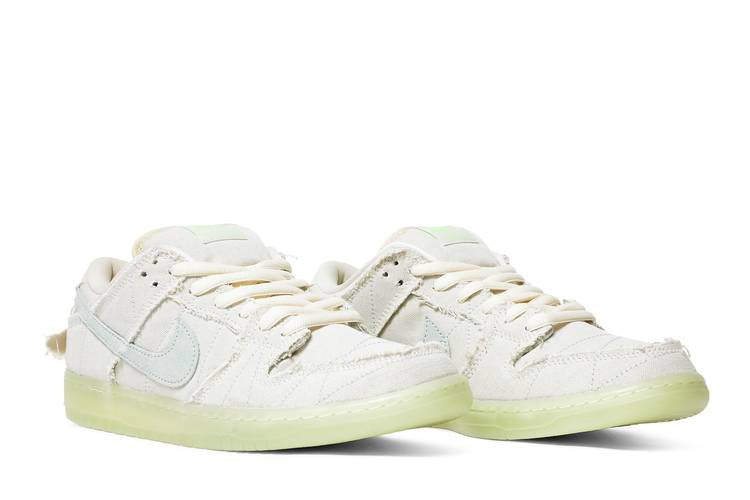 The Nike SB Dunk Low ‘Mummy’ showcases a Halloween-themed design with an off-white canvas upper that can be torn away to reveal a bluish-grey suede underlay. The shoe features tonal decorative stitching, frayed edges, and a glow-in-the-dark semi-translucent rubber cupsole. Eye graphics adorn the back heel, with additional details including an embroidered spider on the left toe box and an Eye of Horus graphic on the interior tongue. Inspired by Ancient Egyptian mummification, this shoe was released in October 2021.