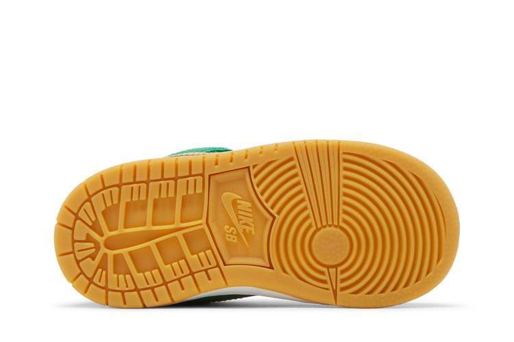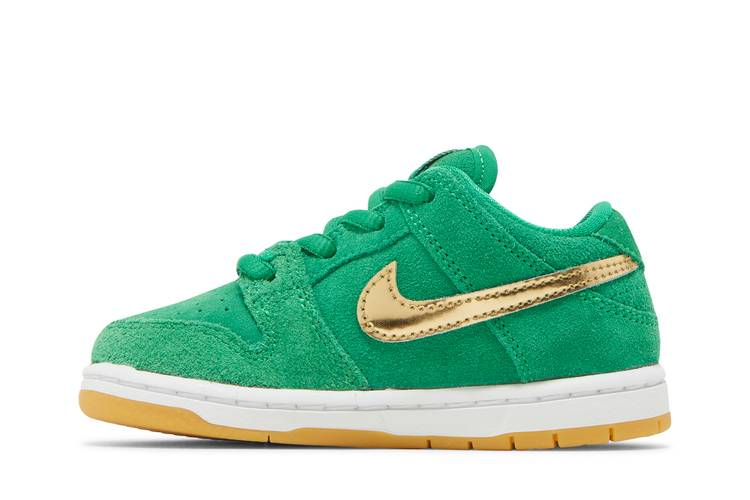 The Nike SB Dunk Low Pro St. Patrick's Day (TD) (2022) is a toddler-sized sneaker inspired by the festive celebration of St. Patrick's Day. It features a green suede upper with a metallic gold Swoosh, a low-cut collar with breathable mesh lining, and Nike branding on the back tab and tongue tag. The shoe also includes a lucky four-leaf clover embroidered on the lateral heel. The gum rubber outsole provides traction for little feet, making it a stylish and functional choice for young sneaker enthusiasts.