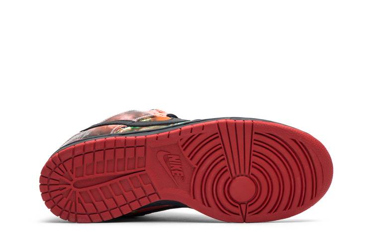 The Nike SB Dunk Low Pushead 1 showcases a distinctive design created by artist Pushead, renowned for Metallica album covers and Thrasher tees. The shoe features a unique paint splatter effect in red, pink, and green tones, highlighted by contrasting black leather overlays, skeletal graphic on the lateral heel, and black midsole. The design is complemented by a red rubber outsole, with artwork extending to the shoebox with an all-over print graphic inspired by the artist's signature style. Brian Schroeder, also known as Pushead, introduced this coveted Nike SB collaboration, released in 2005.