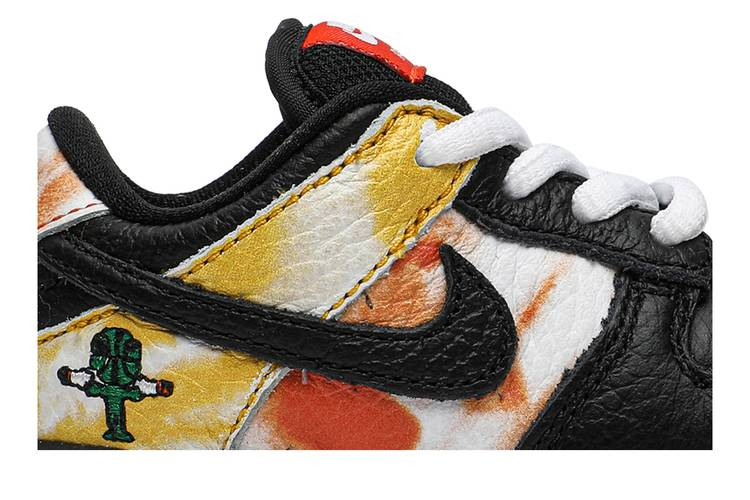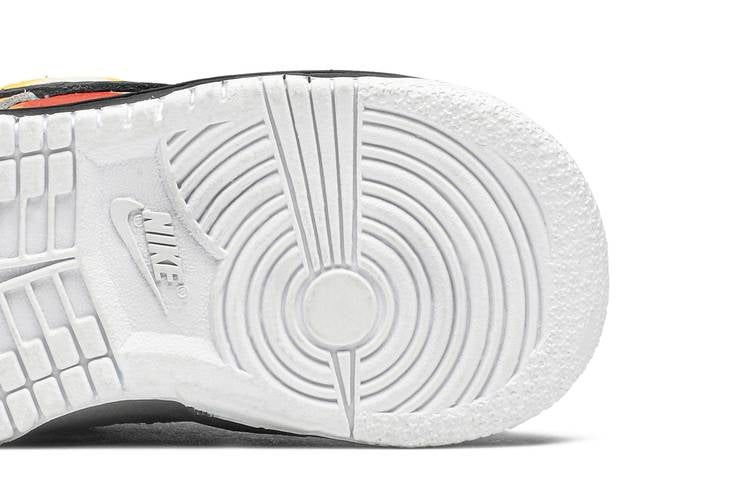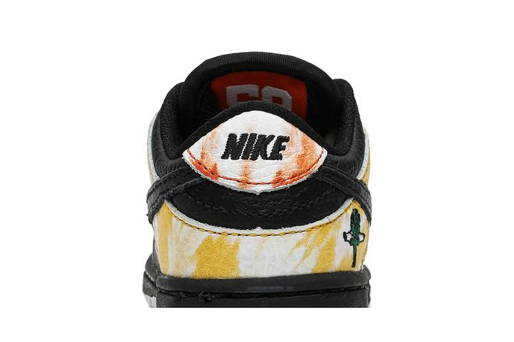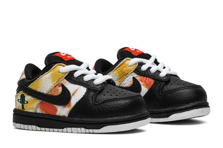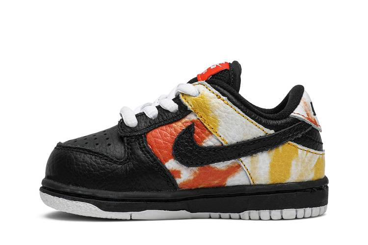 The Nike SB Dunk Low Raygun Tie-Dye Black (TD) is a toddler-sized sneaker inspired by the 2005 Dunk release. Featuring a tie-dye print in honor of Nike executive Sandy Bodecker, this shoe pays tribute to the brand's skateboarding division. The design includes a Rayguns graphic on the lateral heel, referencing the fictional ABA team from Nike Basketball ads. Constructed with orange and yellow leather, black accents, and a trippy tie-dye print, this shoe offers a unique and eye-catching look. The black midsole and white outsole provide durability and traction for little feet. Released on December 28th, 2019, this shoe is a stylish and playful addition to any toddler's wardrobe.