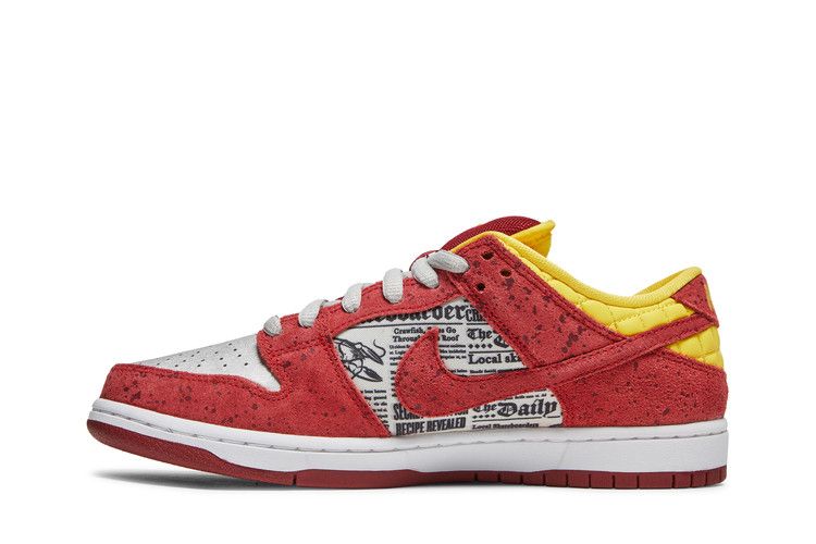 The Nike SB Dunk Low Rukus Crawfish features a leather upper and lining with a rubber sole for durability. The design incorporates newspaper-inspired side panels and speckled red suede, mimicking crawfish shells. A metallic silver toe box and yellow quilted leather heel complete the look, inspired by Louisiana crawfish boils.