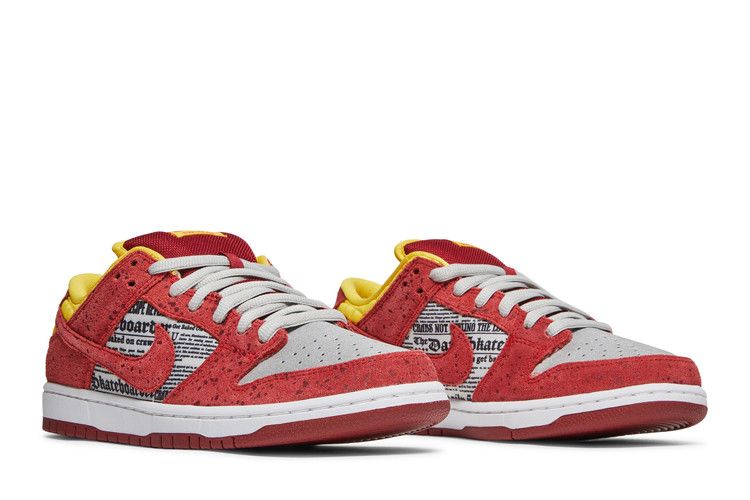 The Nike SB Dunk Low Rukus Crawfish features a leather upper and lining with a rubber sole for durability. The design incorporates newspaper-inspired side panels and speckled red suede, mimicking...