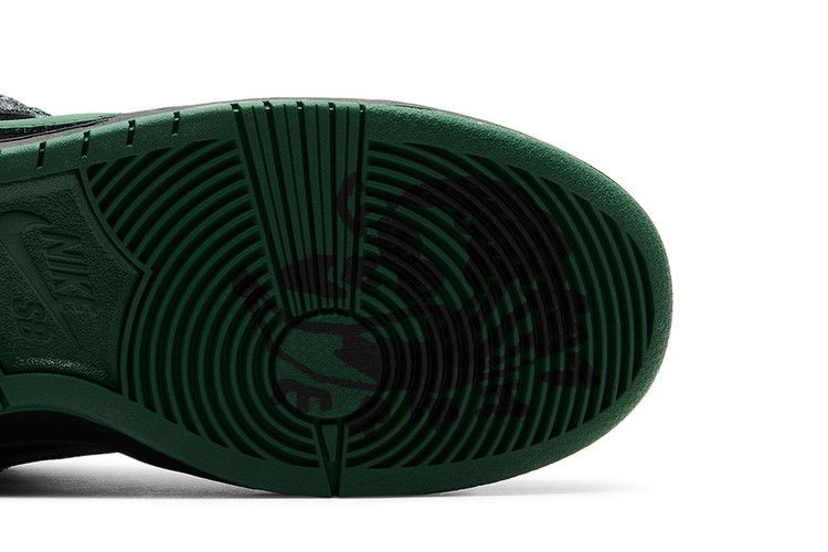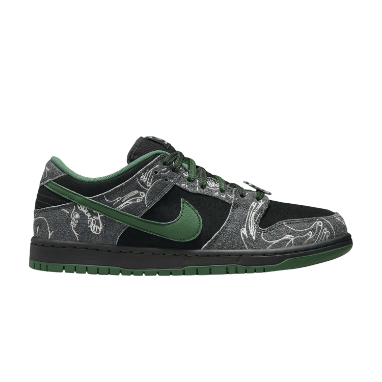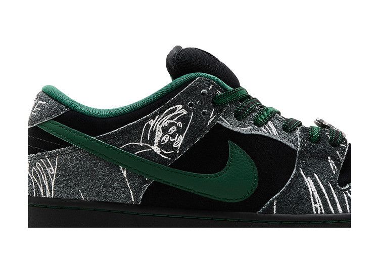 The THERE Skateboards x Nike Dunk Low SB 'Ultra Humanized' features black suede with grey hairy suede overlays and original artwork by Jeff Cheung. Green accents, leather Swoosh, and textile collar lining provide a distinct look. Dual branding on the tongue tag and back tab, along with metallic lace jewels, add unique details. The sneaker boasts a solid black midsole, stitched sidewall construction, and a Gorge Green rubber outsole for durability and style.