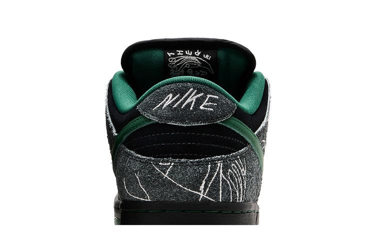 The THERE Skateboards x Nike Dunk Low SB 'Ultra Humanized' features black suede with grey hairy suede overlays and original artwork by Jeff Cheung. Green accents, leather Swoosh, and textile...