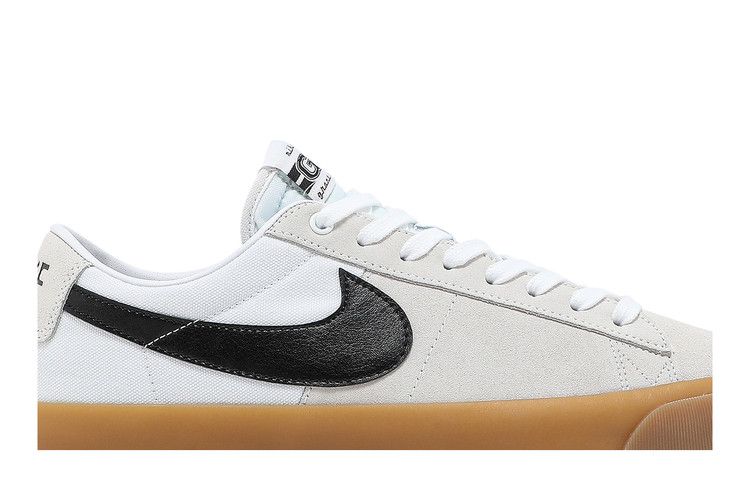 The Nike SB Zoom Blazer Low Pro GT White Gum features a suede upper in white, black, and grey, fused to a vulcanized gum rubber outsole for added strength. Higher taping between the upper and midsole enhances durability, while a Zoom unit in the heel provides impact protection. Released on May 1, 2021, the Nike SB Zoom Blazer Low Pro GT White Gum is available now at Side Kicks.