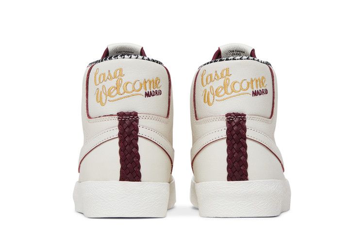 The Nike SB Zoom Blazer Mid QS Welcome Skateboarding features a mid-top silhouette designed for skateboarding. It combines a sail leather upper with star-shaped perforations and sawtooth eyestays. The heel displays "Casa Welcome Madrid" embroidery in dark beet root and gold thread, while a tonal Swoosh with red outline accents the side panel. Released on January 13, 2024, it is available now at Side Kicks.