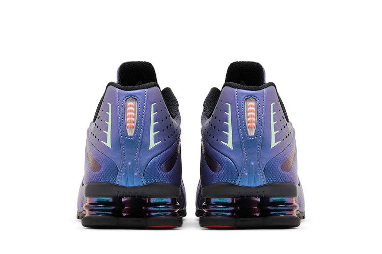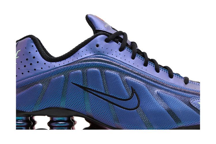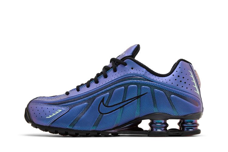 The Nike Shox R4 Iridescent features an iridescent upper that shifts colors under light, paired with sleek black accents. Its classic Shox cushioning provides responsive heel support. The durable construction ensures long-lasting wear, while the comfortable fit suits all-day use. Released on {date}, the Nike Shox R4 Iridescent is available now at Side Kicks.