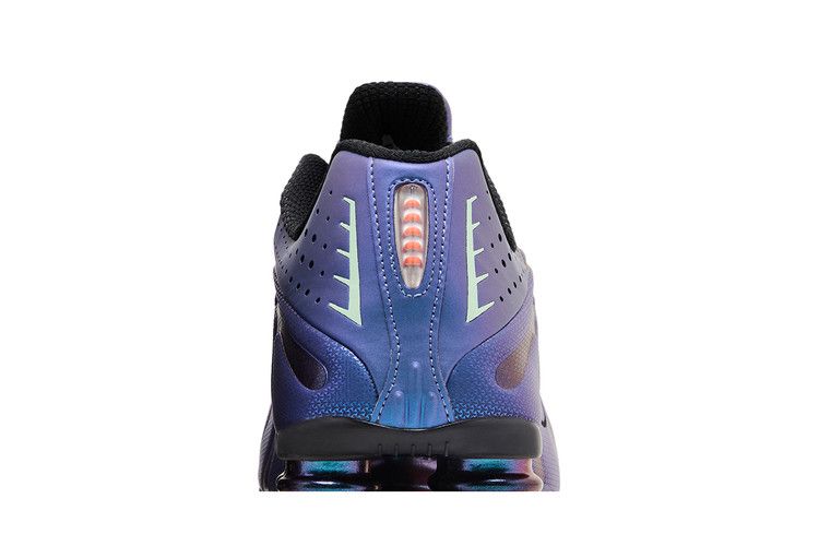 The Nike Shox R4 Iridescent features an iridescent upper that shifts colors under light, paired with sleek black accents. Its classic Shox cushioning provides responsive heel support. The durable construction...