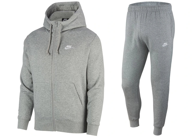 The Nike Sportswear Club Fleece Full-Zip Hoodie & Joggers Set Dark Grey Heather/Matte Silver/White is now available at Side Kicks!