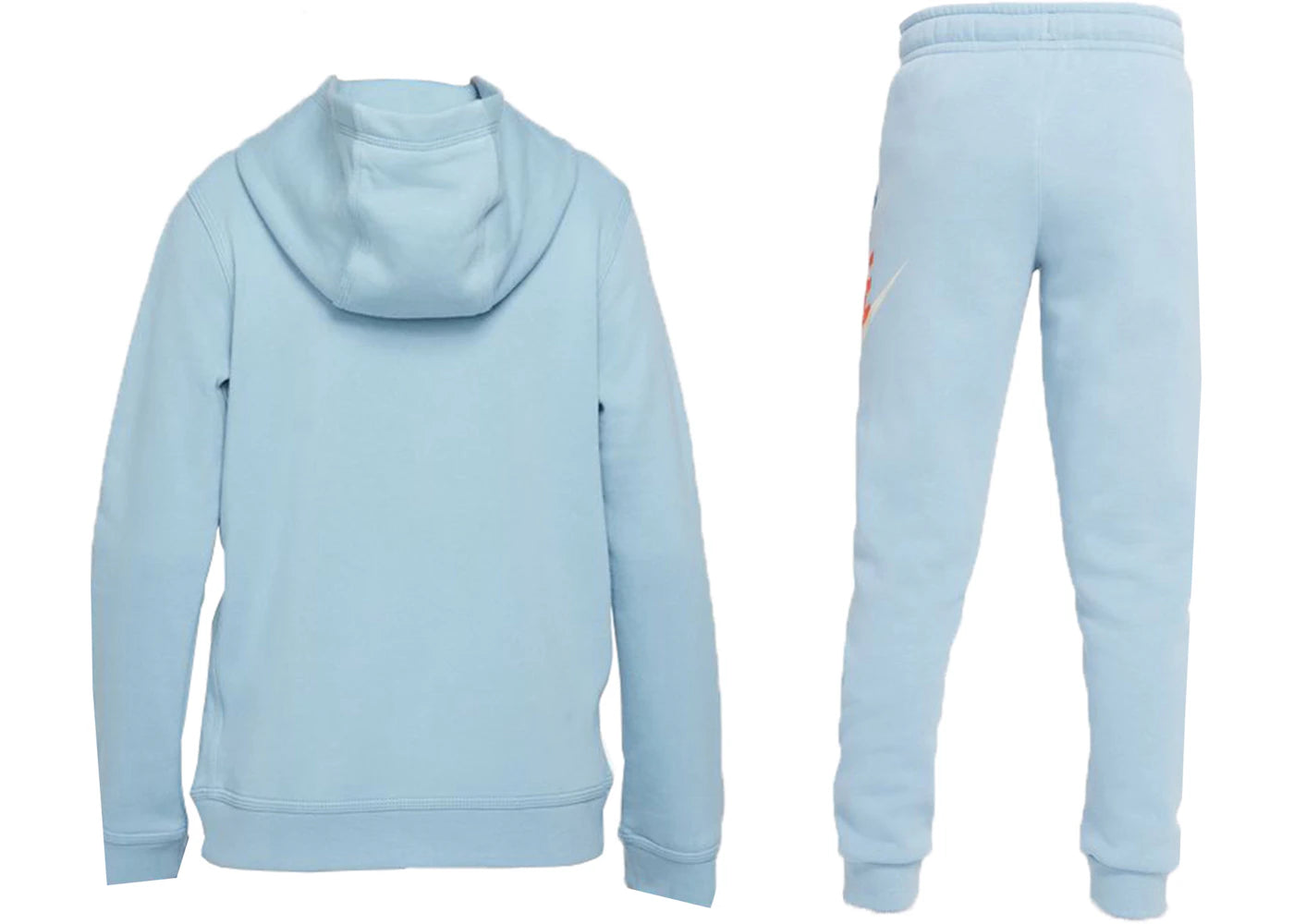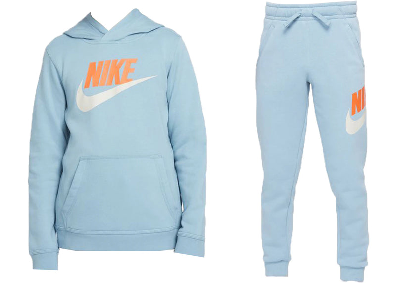 The Nike Sportswear Club Fleece Pullover Hoodie & Pants Set Worn Blue/Rush Orange is now available at Side Kicks!