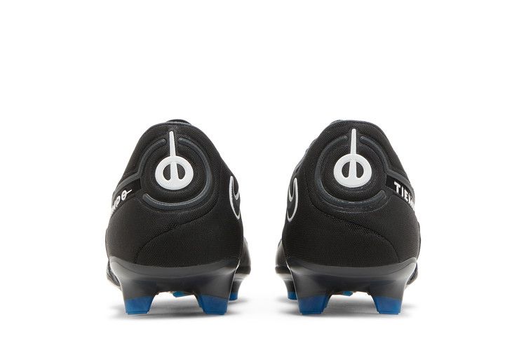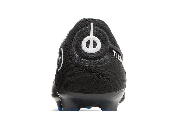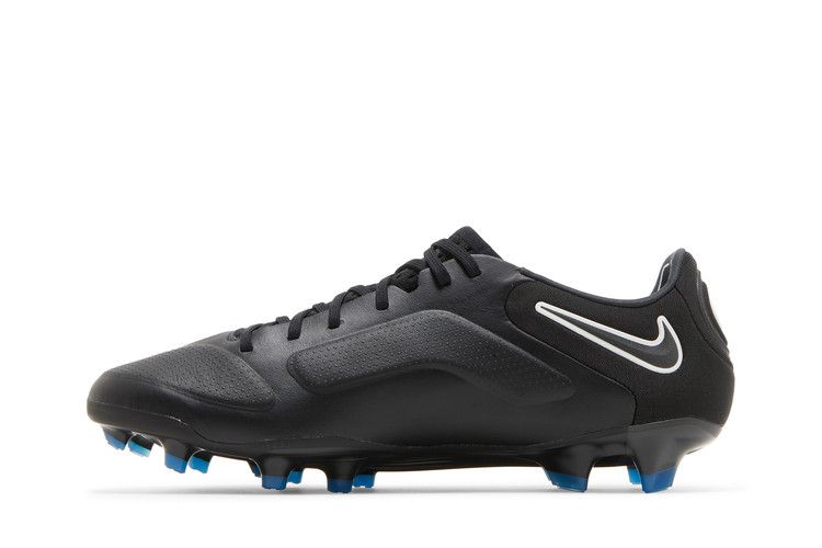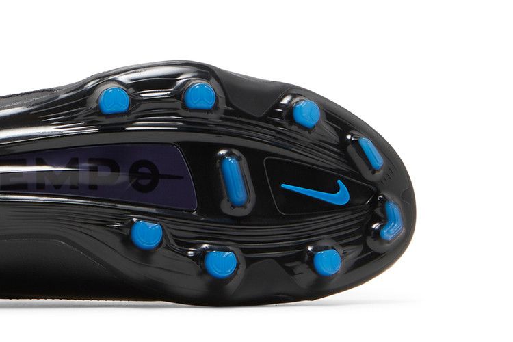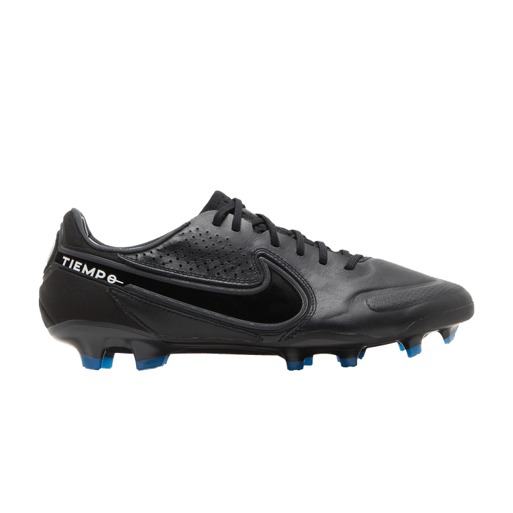 The Nike Tiempo Legend 9 Elite FG Shadow Pack features a black k-leather upper with perforations for airflow and soft foam pods for precision. The cushioned insole and adaptive mesh tongue ensure comfort, while the Quadfit mesh lining includes additional foam padding. A black sole plate with blue-tipped studs provides stability and grip on firm ground. White branding contrasts the design, with Tiempo logos on the lateral side and heel tab, plus a backward Nike swoosh on the medial collar. Released on September 1, 2022, the Nike Tiempo Legend 9 Elite FG Shadow Pack is available now at Side Kicks.