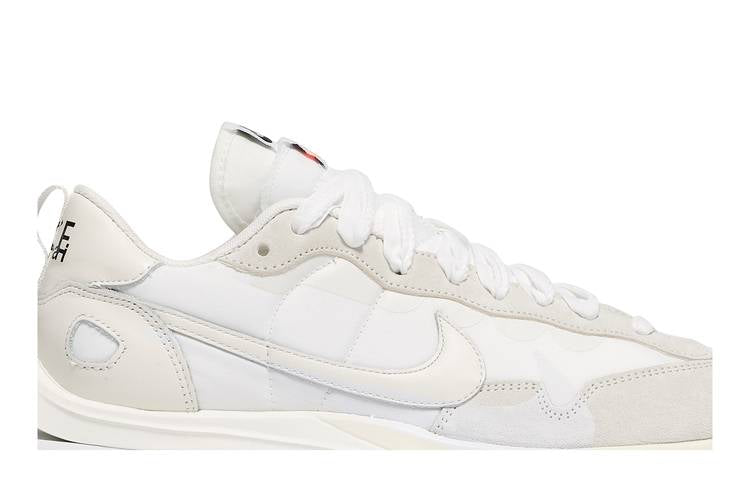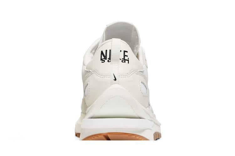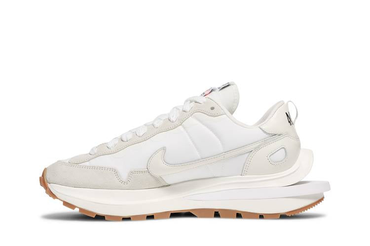 The sacai x Nike VaporWaffle ‘Sail Gum’ combines a white nylon base with off-white suede and leather overlays, inspired by the Vaporfly and original Pegasus. Doubled laces and tongues, co-branded woven tag, and stacked foam midsole with split detailing at the heel offer a unique design. The waffle-traction gum rubber outsole provides excellent grip for everyday wear.