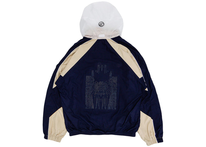 The Nike x CE Track Jacket Navy/Tan features a navy-and-tan color scheme with prominent Nike and Cav Empt logos on the front. It includes a navy zipper with a fabric pull, side zippered pockets, sleeve logos, and a faded back illustration. The lightweight design has a loose front, baggy hood, and wide sleeves with cuffed wrists.