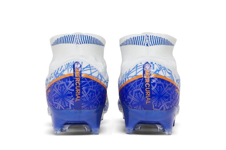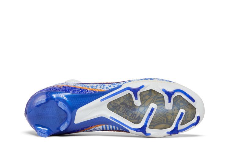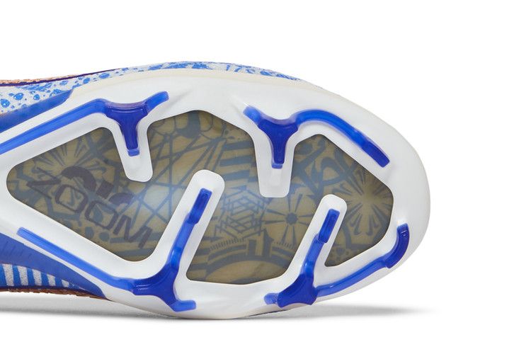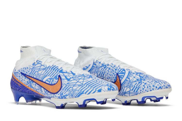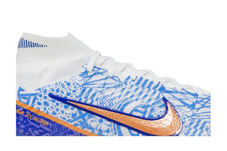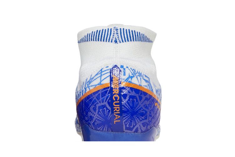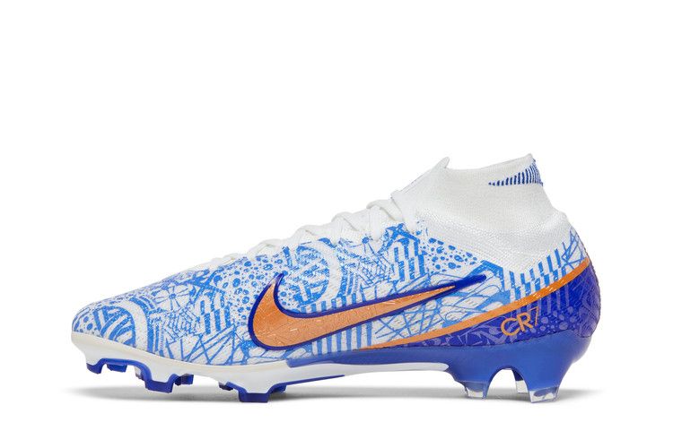 The Nike Zoom Mercurial Superfly 9 Elite CR7 FG Azulejo features a blue and white Vaporposite+ upper with a textured grid mesh for enhanced ball control. A Flyknit ankle sleeve provides a secure, stretchy fit, while the midfoot cage ensures lightweight lockdown. The outsole includes blue tri-star studs for quick directional changes and explosive acceleration. Orange striping adds contrast to the Portuguese tile-inspired design.