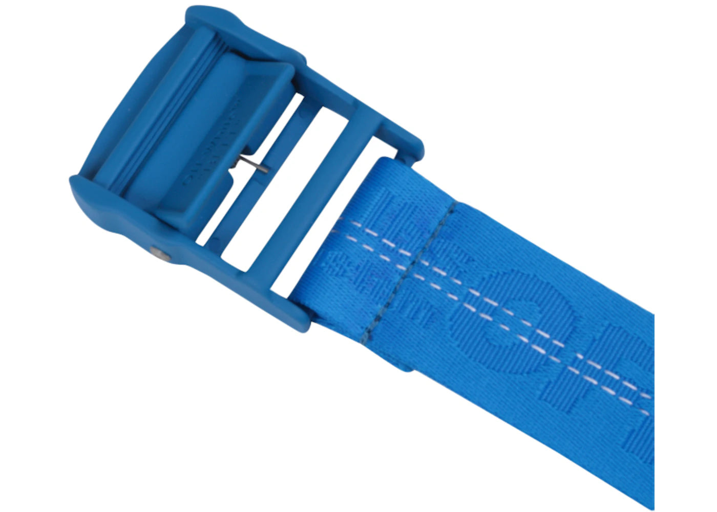 The gradient industrial belt features gradient nylon webbing in orange-to-blue tones with white top-stitching and text detailing. It includes a metallic buckle with an engraved logo hinge. Released on Spring/Summer 2019, the gradient industrial belt is available now at Side Kicks.