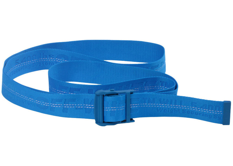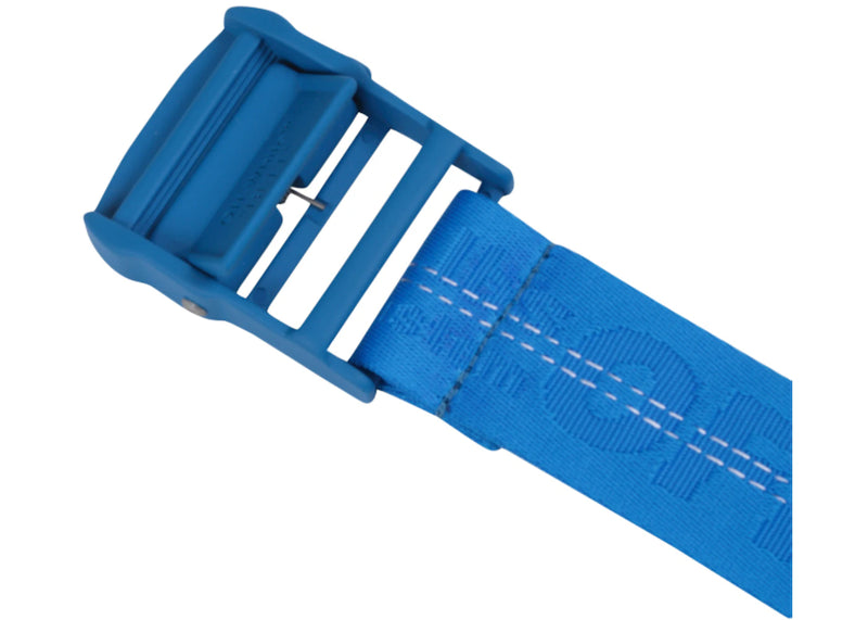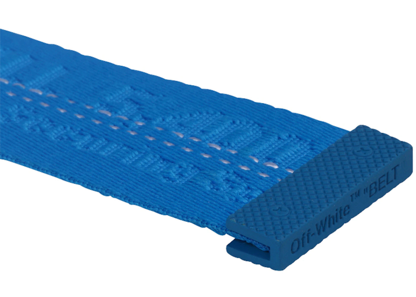 The gradient industrial belt features gradient nylon webbing in orange-to-blue tones with white top-stitching and text detailing. It includes a metallic buckle with an engraved logo hinge. Released on Spring/Summer...