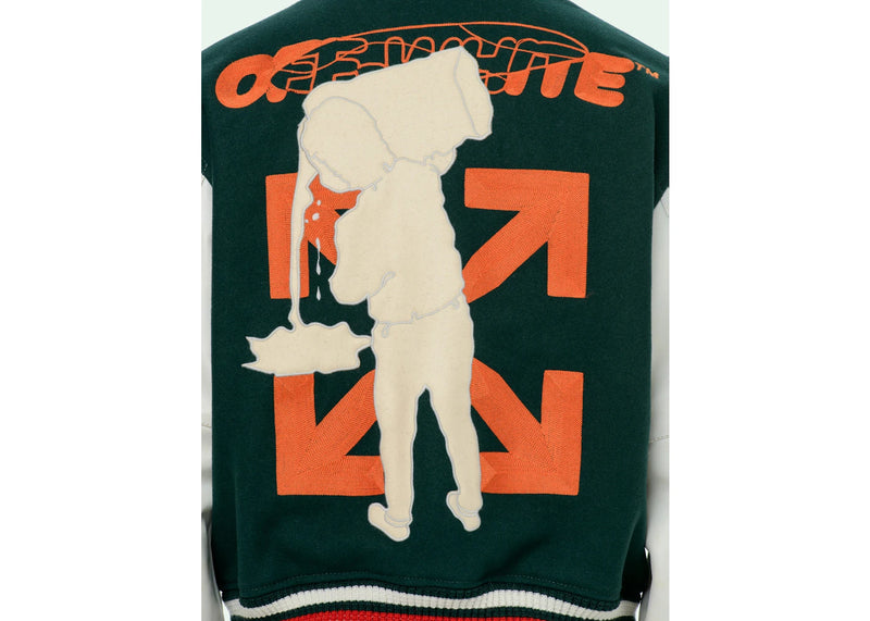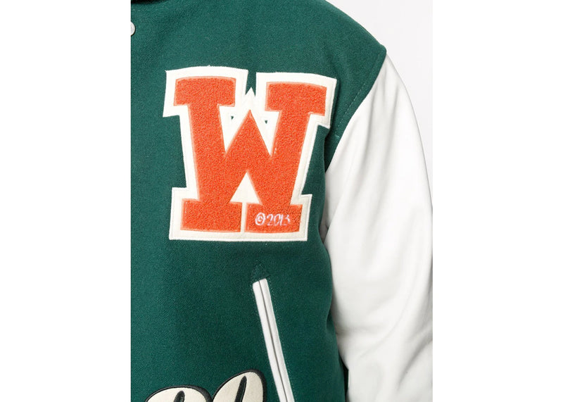 The OFF-WHITE Leather Logo Patch Varsity Jacket Dark Green/Orange is now available at Side Kicks!