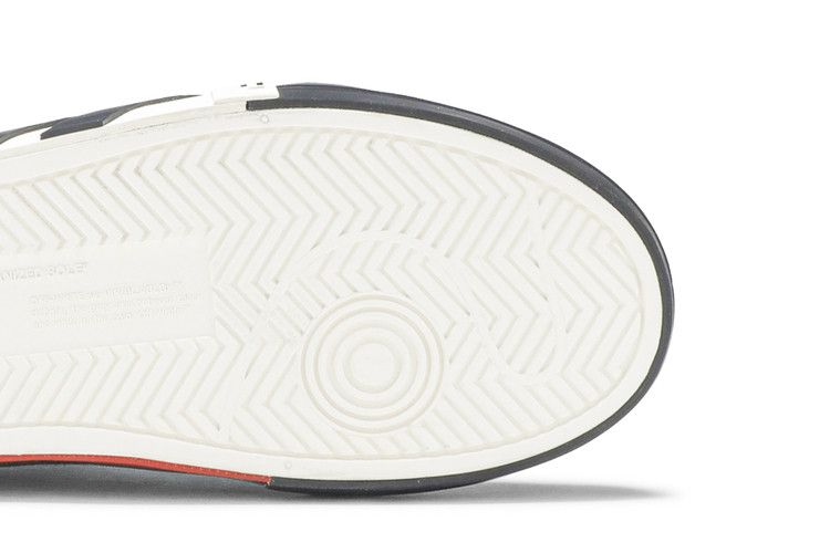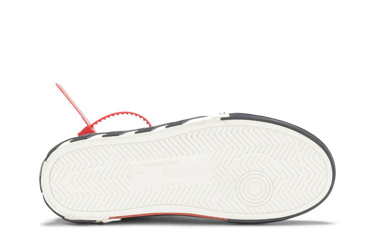 The OFF-WHITE Vulc Low Updated Stripes Black (Women's) features a black textile and suede upper with white laces, tongue branding, and a red signature zip tie. White intersecting arrows adorn...