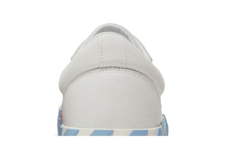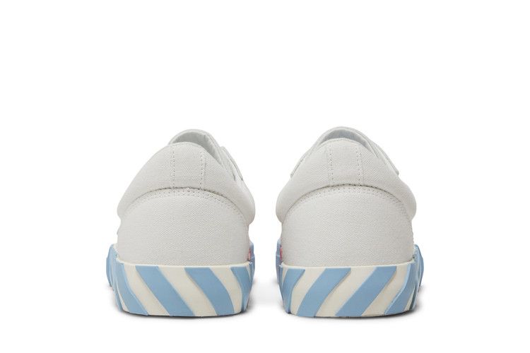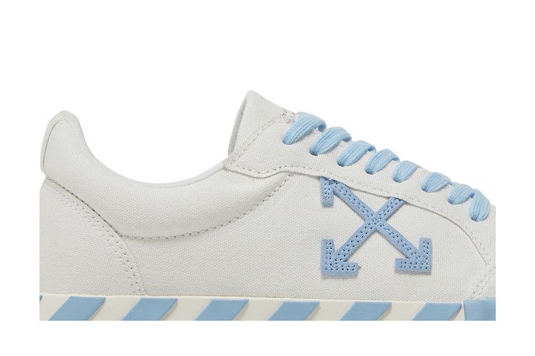 The OFF WHITE Vulc Low Black Light Blue Arrow features a black leather upper with light blue accents on the arrow logo and heel tab. It has a vulcanized sole...