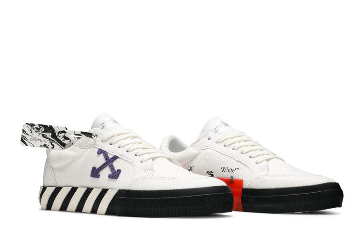 The OFF WHITE Vulc Low White Purple SS21 has a white leather upper with purple accents on the heel and tongue. It features a vulcanized rubber sole for traction and...