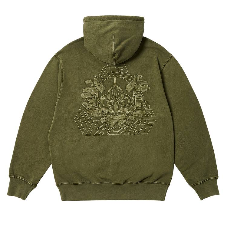 The Palace Demon Hood 'The Deep Green' is a distinctive hoodie with intricate embroidery on the back. It is designed to have an oversized boxy fit for comfort and style. Made with high-quality materials, this hoodie is versatile for various occasions.