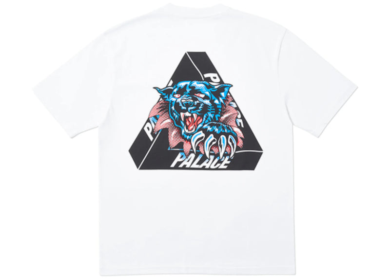 The Palace Ripped T-shirt White is made from 100% cotton for comfort. It features colorful graffiti detailing and a sporty aesthetic. The sleeves and hem have a slightly padded finish, while the ribbed crewneck includes thick white piping. A gray Tri-Ferg logo appears on the back neckline. The front displays a subtle design with a snarling panther Tri-Ferg, while the back showcases a bold black Tri-Ferg motif with white "Palace" imprints and a blue panther graphic.