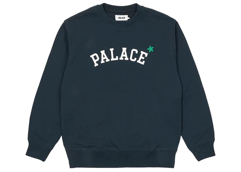 The Palace Star Script Crew Navy features a v-neck design with a multicolored composition. The front displays the Palace logo in bright blue, accented by a red star. The navy...