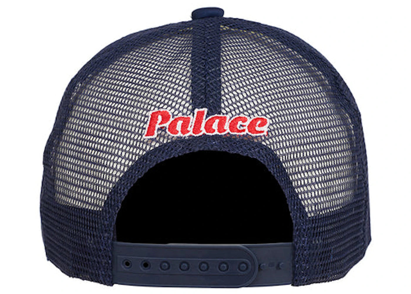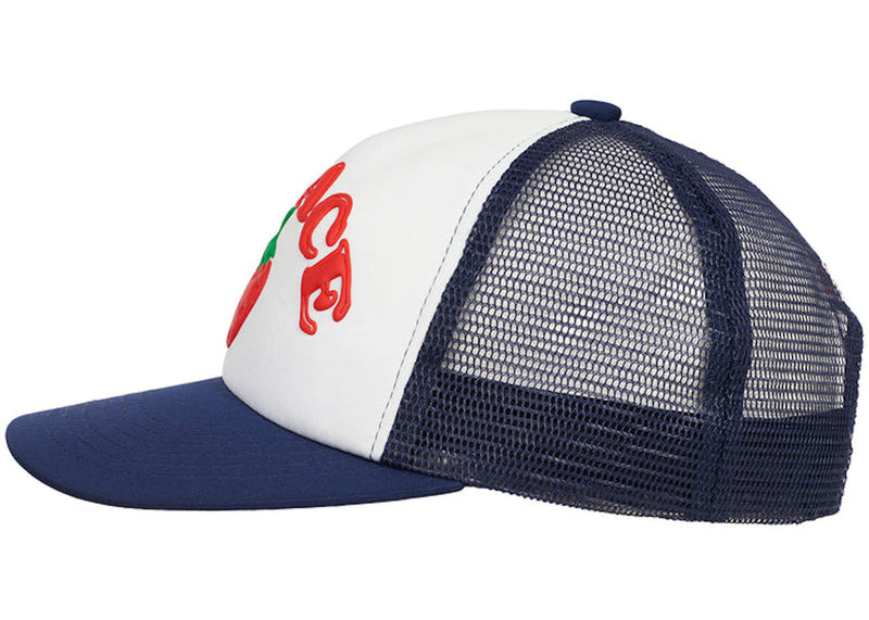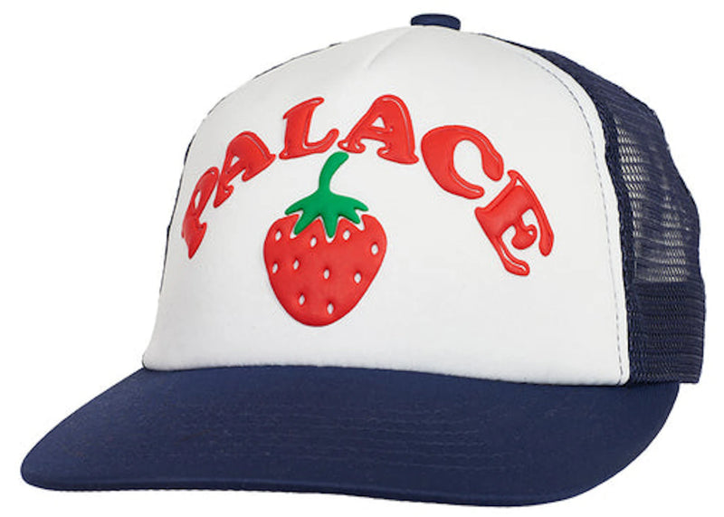 The Palace Strawberry Trucker Hat Navy is now available at Side Kicks!