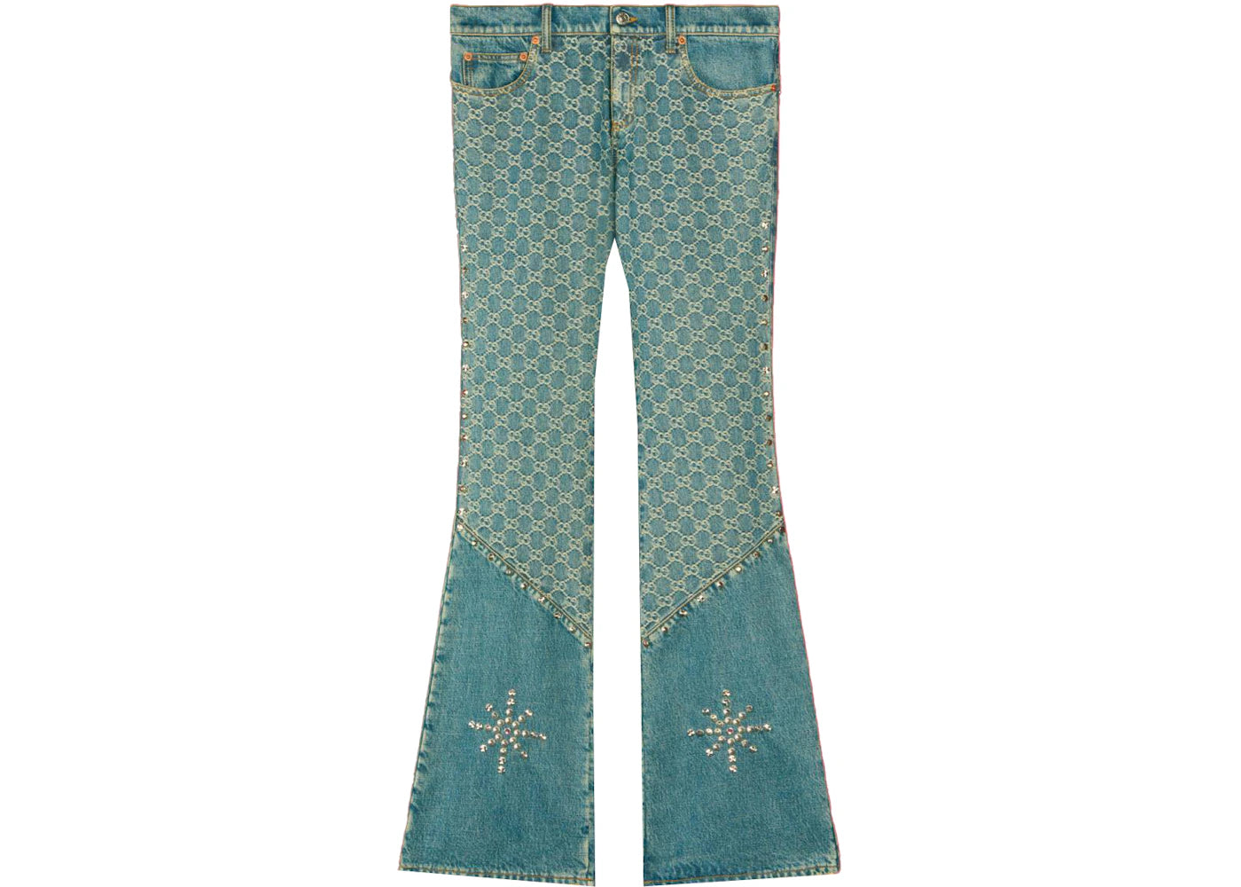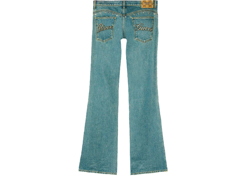The Palace x Gucci Allover GG Pattern And Studs Bootcut Jeans Blue Denim is now available at Side Kicks!