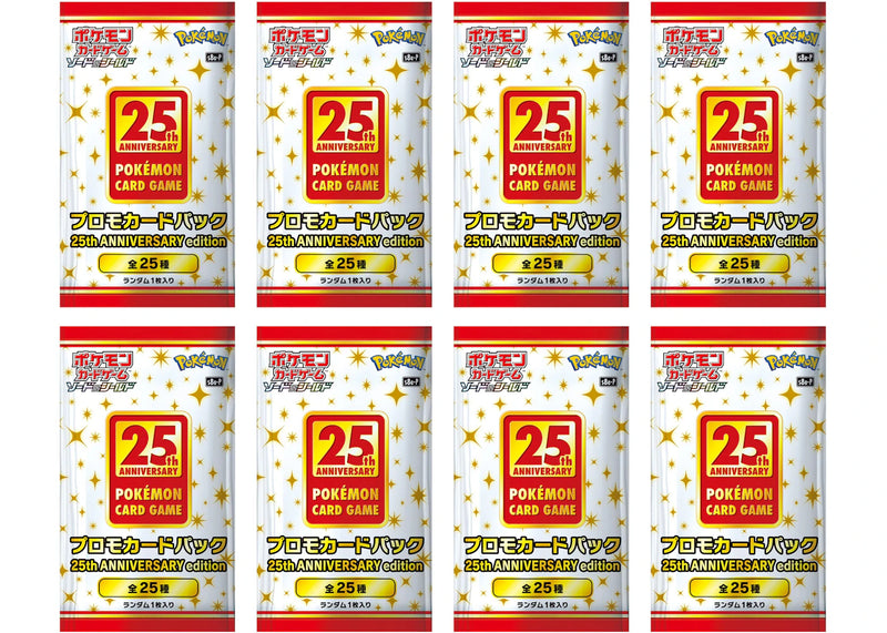 With each order of this Japanese Pokémon card product, you will receive eight (8) Pokémon 25th Anniversary Collection Promo Card Packs. For more information regarding the contents of each Pokémon 25th Anniversary Collection Promo Card Pack, you can click here.