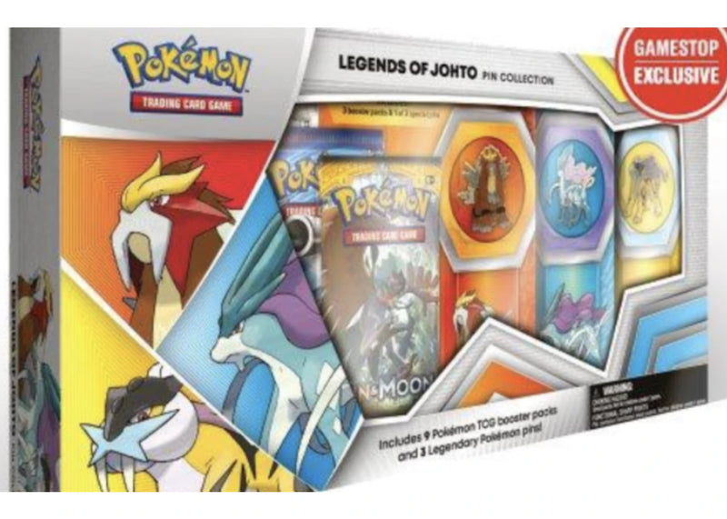 The Pokémon TCG Legends of Johto Pin Collection celebrates the legendary Pokémon of the Johto region. The Pokémon card box comes with three legendary Pokémon pins featuring Raikou, Entei, and Suicune. You also receive nine Pokémon card booster packs - three packs of Sun & Moon Base, three packs of XY Evolutions, and three packs of XY Steam Siege.