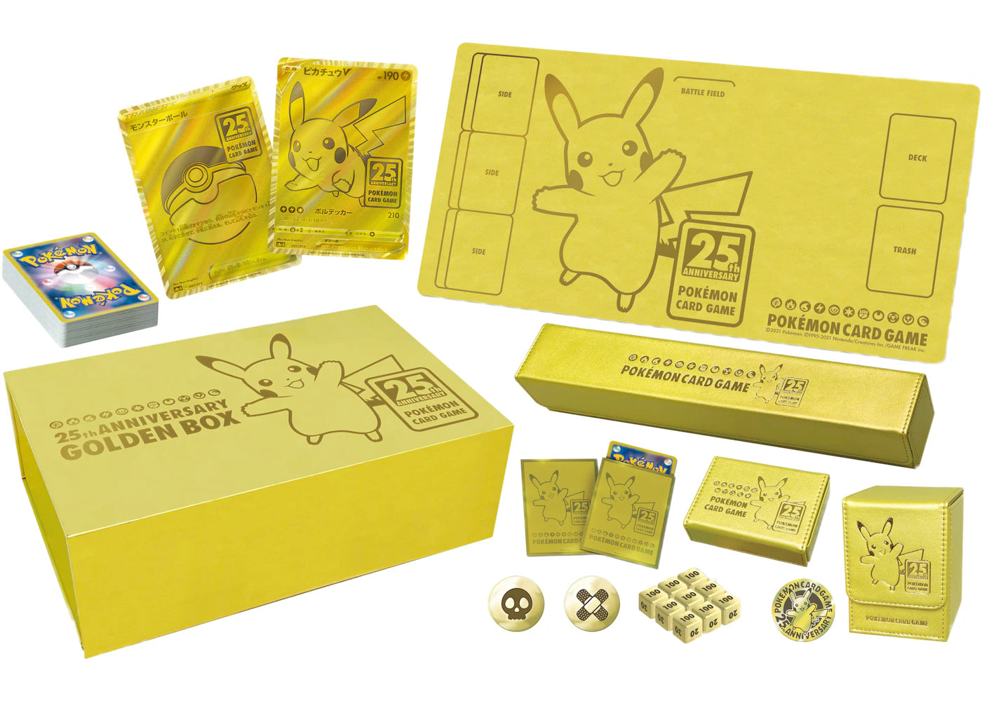 The Pokémon 25th Anniversary Collection Golden Box is packed full of essential cards and collectibles for any Pokémon trainer, fan, and collectors alike. Inside of the Pokémon 25th Anniversary Collection Golden Box you will find a gold Pokéball card, a gold Pikachu V card, a 60 card deck made up of exclusively holos, 64 premium gloss card sleeves, a foil stamped rubber playmat, metal dice, metal condition markers, a synthetic leather deck case, a synthetic leather playmat case, a synthetic leather dice case, a Pokémon coin, and five Pokémon 25th Anniversary booster packs. The Pokémon 25th Anniversary Collection Golden Box officially released on October 22, 2021.