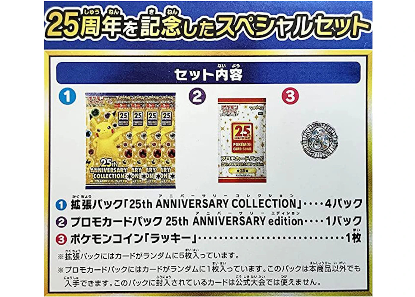The Pokémon 25th Anniversary Collection Special Set comes with four 25th Anniversary Collection booster packs, one exclusive 25th Anniversary Collection promo card pack, and a Pokémon coin.