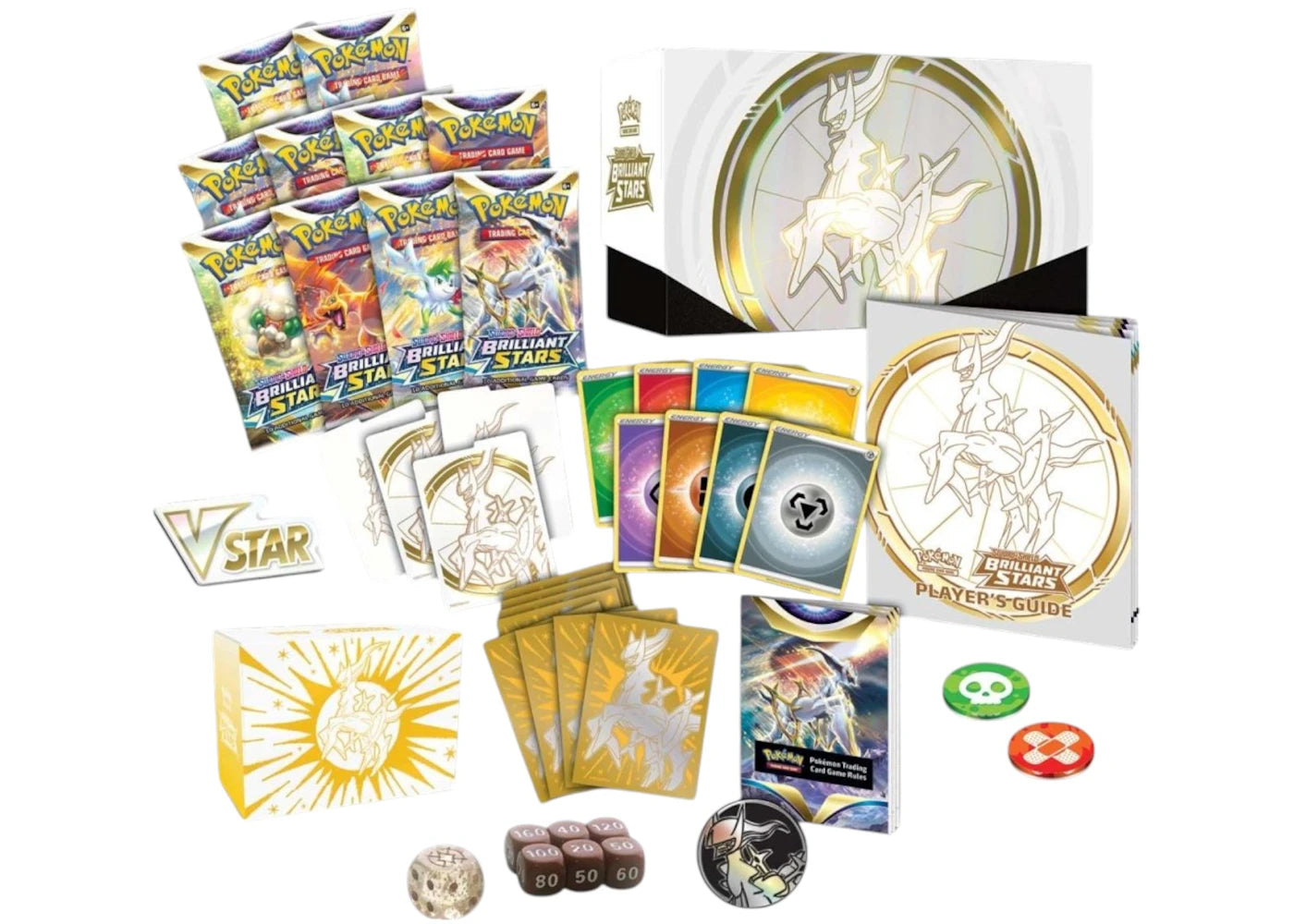 The Pokémon Brilliant Stars Pokémon Center Elite Trainer Box includes ten Pokémon Brilliant Stars booster packs, 65 card sleeves featuring Arceus, 45 Energy cards, plus several assorted gameplay accessories.
