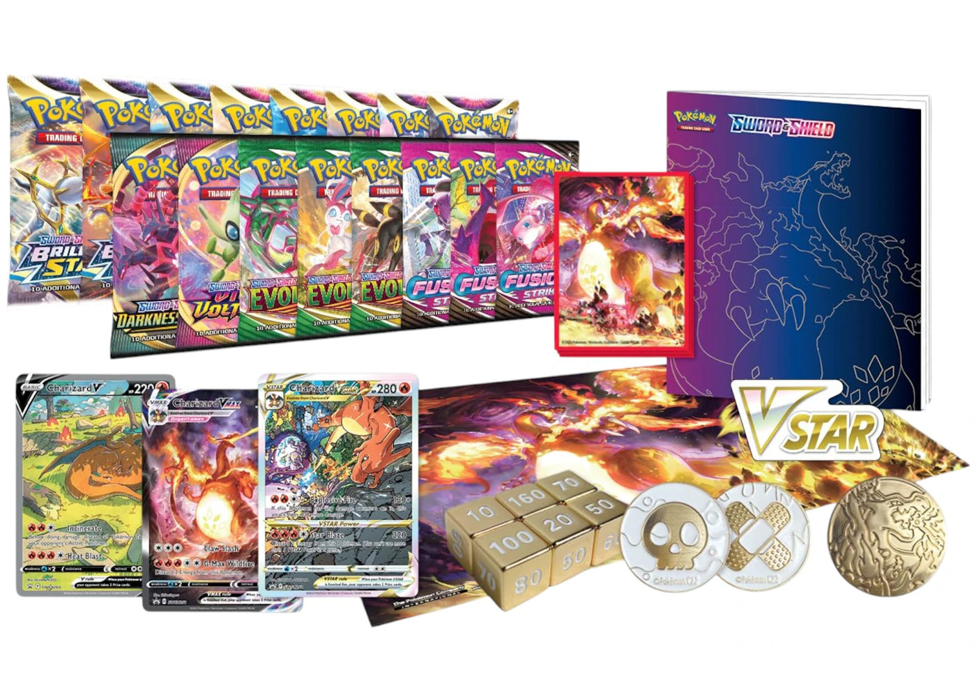 This Charizard Ultra Premium Collection Box features 3 etched foil promo cards, a play mat with Gigantamax Charizard, 65 card sleeves, 6 metal damage-counter dice, an acrylic VSTAR marker, a metal coin, two metal condition markers, and a 16 Pokémon TCG booster packs.
