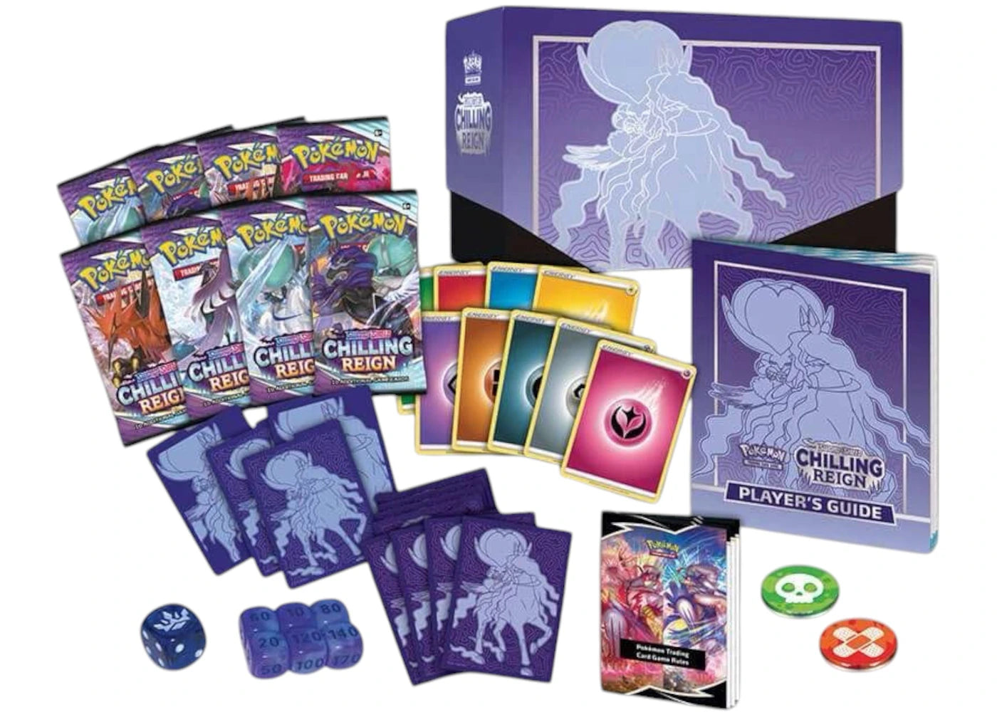 The Pokémon Chilling Reign Elite Trainer Box (Shadow Rider Calyrex) is loaded with eight Pokémon Chilling Reign booster packs, holding ten cards each. Inside the box, you will also find 65 card sleeves featuring Shadow Rider Calyrex, 45 Pokémon TCG energy cards, a collector’s box, an online code card for the Pokémon TCG Online game, and the standard gameplay accessories found in Elite Trainer Boxes.