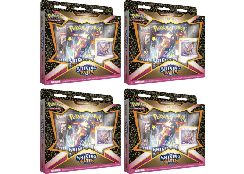 You will receive four (4) 2021 Pokemon TCG Sword & Shield Shining Fates Mad Party Pin Bunnelby Collections. For more details on this Pokémon TCG product, you can click here....