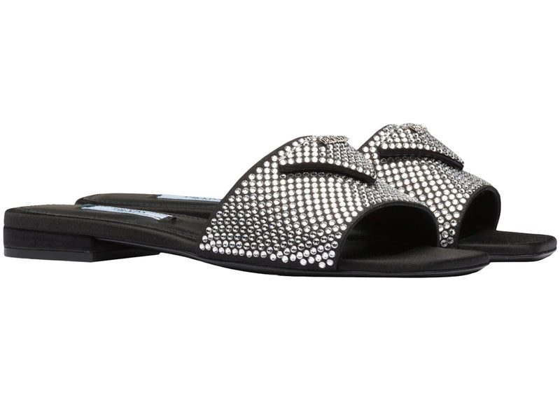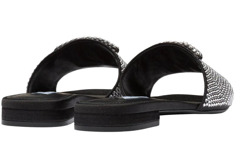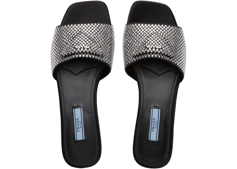 The Prada 10mm Crystal Slides Black Satin is now available at Side Kicks!